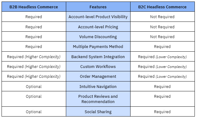 One of the key differences between B2B and B2C headless commerce is the complexity of features required for B2B transactions. B2B headless commerce requires more complex features such as order management, pricing, and quotes, which are not typically required in B2C headless commerce.